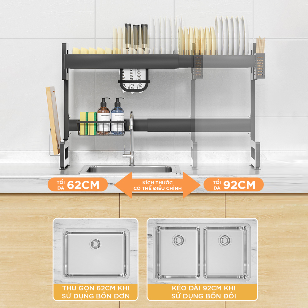 - Kệ chén đĩa có thể kéo dài chiều ngang tùy theo kích thước bồn rửa của gia đình.