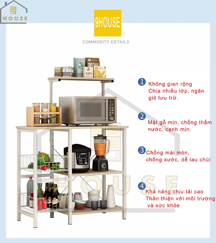 Giới thiệu Kệ lò vi sóng đa năng 185N thương hiệu 9House kệ bếp để lò nướng nồi cơm điện kèm giá rổ để rau củ gia vị loại khung sắt dày sơn tĩnh điện chống rỉ mặt gỗ MDF lõi xanh chống ẩm bề mặt phủ melamine chống thấm cao cấp - Hàng chính hãng