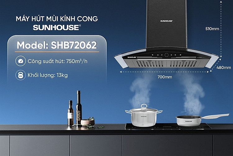Máy hút mùi kính cong SUNHOUSE SHB72062 có công suất 750m³ /h, 3 tốc độ hút cho hiệu quả hút mùi tốt ưu lại tiết kiệm điện năng. Mùi dầu mỡ hay các mùi khó chịu khác trong quá trình nấu nướng sẽ nhanh chóng bị hút sạch, không ám mùi lên quần áo, các vật dụng nhà bếp hay các không gian liền kề khác (điển hình như thiết kế căn hộ chung cư).