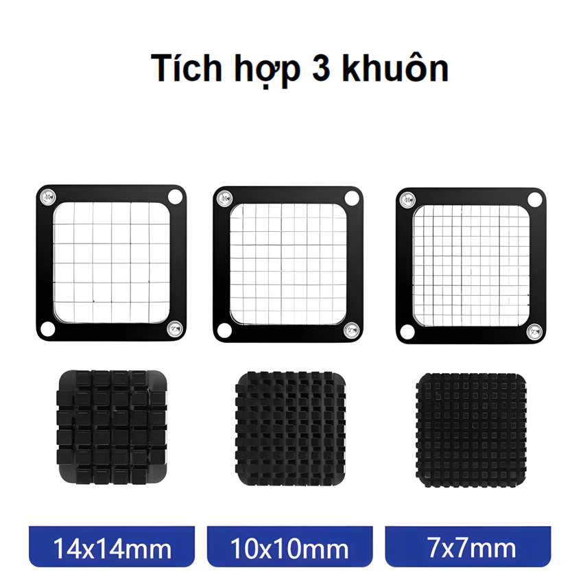 Kích thước | Thông số kỹ thuật:-Thương hiệu: Septree (USA - MỸ)- Nhà máy sản xuất đặt tại: Trung Quốc- Công suất: 550W- Điện áp: 24V/10A- Lực đẩy: 800N- Độ ồn:≤ 60dB- Số lượng lưỡi dao: 3 lưỡi- Kích thước khuôn: 7mm, 10mm và 14mm- Kích thước ống nguyên liệu: Dài 20, rộng 15cm- Chất liệu: Thép không gỉ- Chất liệu nắp đậy: Mica- Kích thước: 620mm x 168mm x 240mm- Trọng lượng: 8.5kg*Chứng nhận chất lượng: 3C, CE, WEEE, EMC, ROHS, ERP, LFGB, REACH, FCC* Bộ sản phẩm bao gồm:Thân máy, 3 lưỡi dao, adapter và hướng dẫn sử dụng |