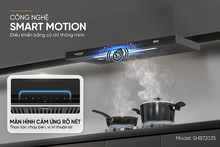Máy hút mùi SUNHOUSE SHB72035 ứng dụng công nghệ cảm biến cử chỉ thông minh Smart Motion, mang đến trải nghiệm điều khiển hoàn toàn không chạm. Chỉ với thao tác cái vẫy tay, người dùng có thể dễ dàng bật/tắt máy hoặc điều chỉnh tốc độ hút theo nhu cầu. Tính năng này không chỉ đảm bảo bề mặt máy luôn sạch sẽ, giảm thiểu tiếp xúc trực tiếp để hạn chế vi khuẩn, mà còn tiện lợi khi bận rộn nấu nướng.