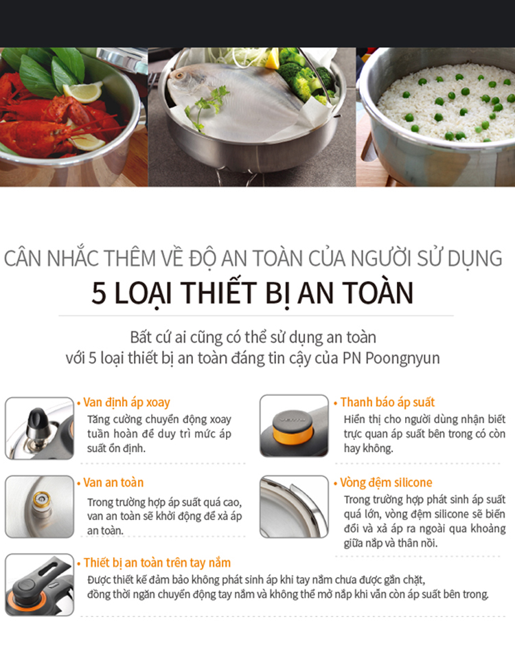 Nồi áp suất Inox từ tính POONGNYUN (PN) VTSPC-10 với thiết kế 7 chế độ an toàn cho sản phẩm giúp bạn an tâm trong khi nấu : Khóa nắp an toàn (không tạo áp suất khi chưa khóa nắp), Van an toàn (tự động xả hơi nếu áp suất trong nồi vượt mức cho phép do bị nghẹt bọt thức ăn ở lần nấu trước đó cũng như cảnh báo áp suất còn trong nồi hay không), Nút tín hiệu (cảnh báo áp suất còn trong nồi hay không), Nắp bảo vệ van an toàn và nút tín hiệu (ngăn không cho thức ăn làm nghẹt van), Ron (không tạo áp suất khi ron lắp không đúng cách), Van an toàn (tự động khóa nắp khi bên trong còn áp suất), Van an toàn (cảnh báo cho khách hàng biết còn áp suất bên trong nồi).