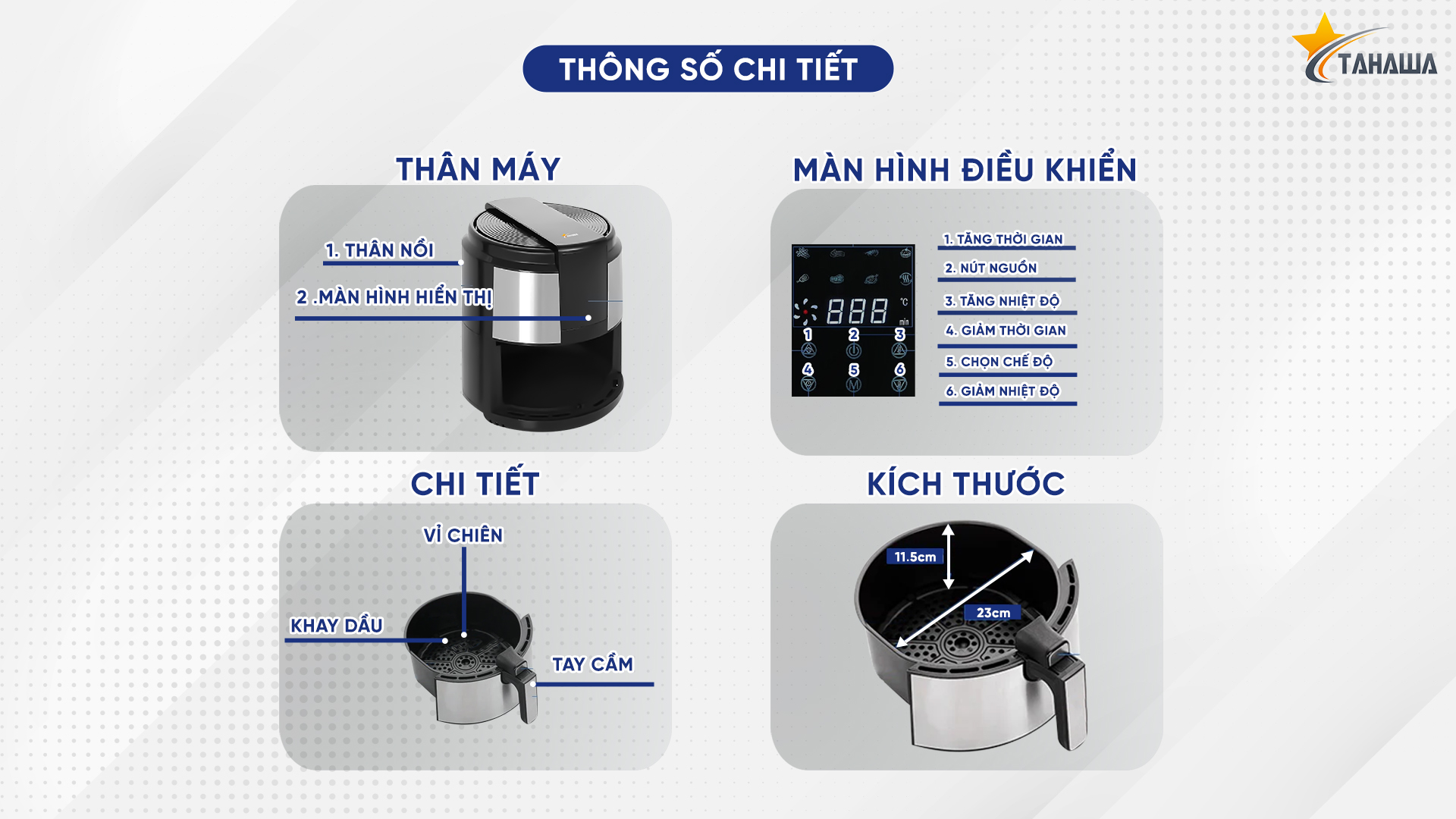 Nồi chiên không dầu Tahawa TH-221 5 lít dễ dàng làm hài lòng mọi khách hàng với thiết kế tinh tế, điều khiển hiện đại, tích hợp công suất mạnh mẽ, công nghệ tiên tiến cho món chiên nướng thơm ngon, hấp dẫn và tiện chế biến hơn bao giờ hết, sản phẩm của thương hiệu Tahawa, lựa chọn tin cậy cho bạn.
